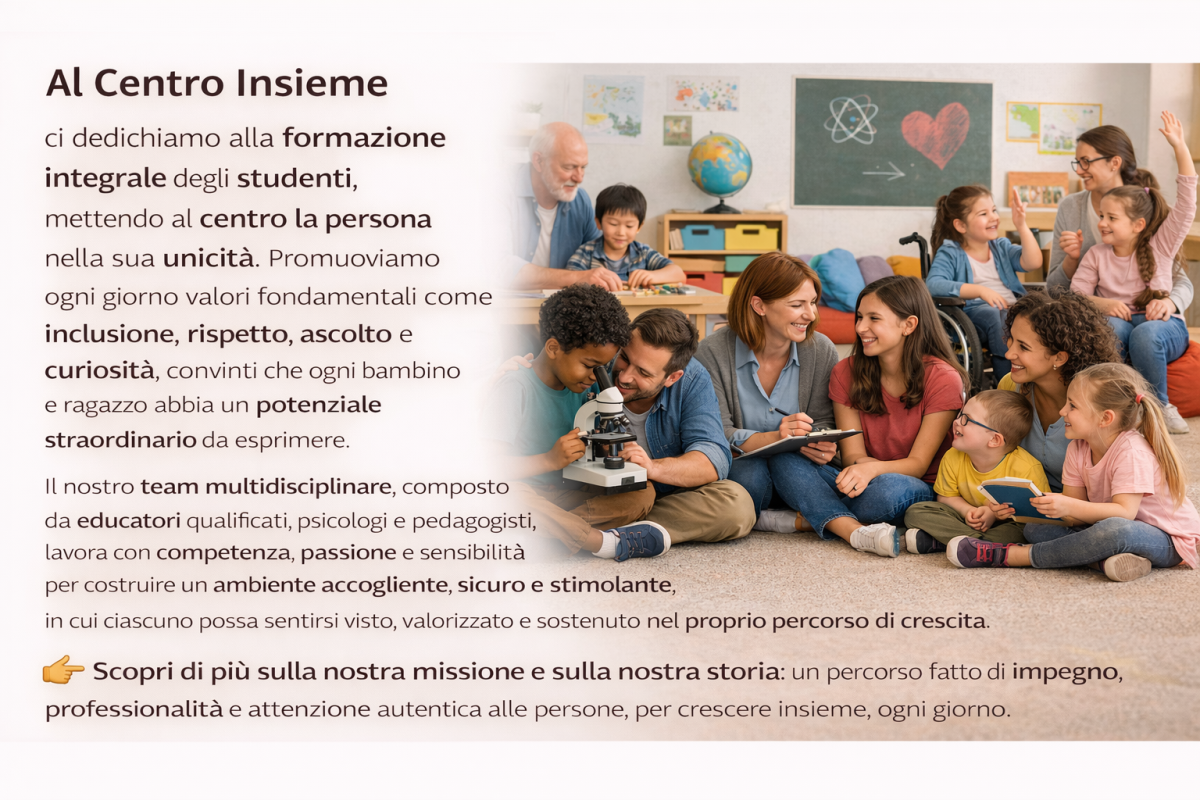 "Benvenuti al Centro Insieme, dove l'educazione e la comunità si incontrano. Offriamo un ambiente stimolante e inclusivo per favorire la crescita e lo sviluppo di ogni studente. Scopri di più sui nostri programmi innovativi e unisciti a noi per costruire insieme il futuro dei nostri ragazzi."